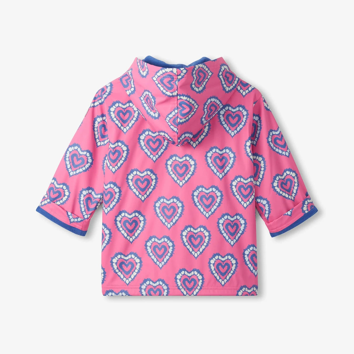 Puddle-lovers, rejoice! Made from waterproof polyester and lined with soft blue fabric, this vibrant rain jacket is designed to keep your little one cozy and dry. The bright pink background is covered in playful layered heart motifs, outlined in soft blue and white for a bold, graphic twist. A contrasting blue front zipper adds a fun colour pop, while pockets provide a cozy spot for hands or hidden treasures. Rainy days never looked so cheerful!